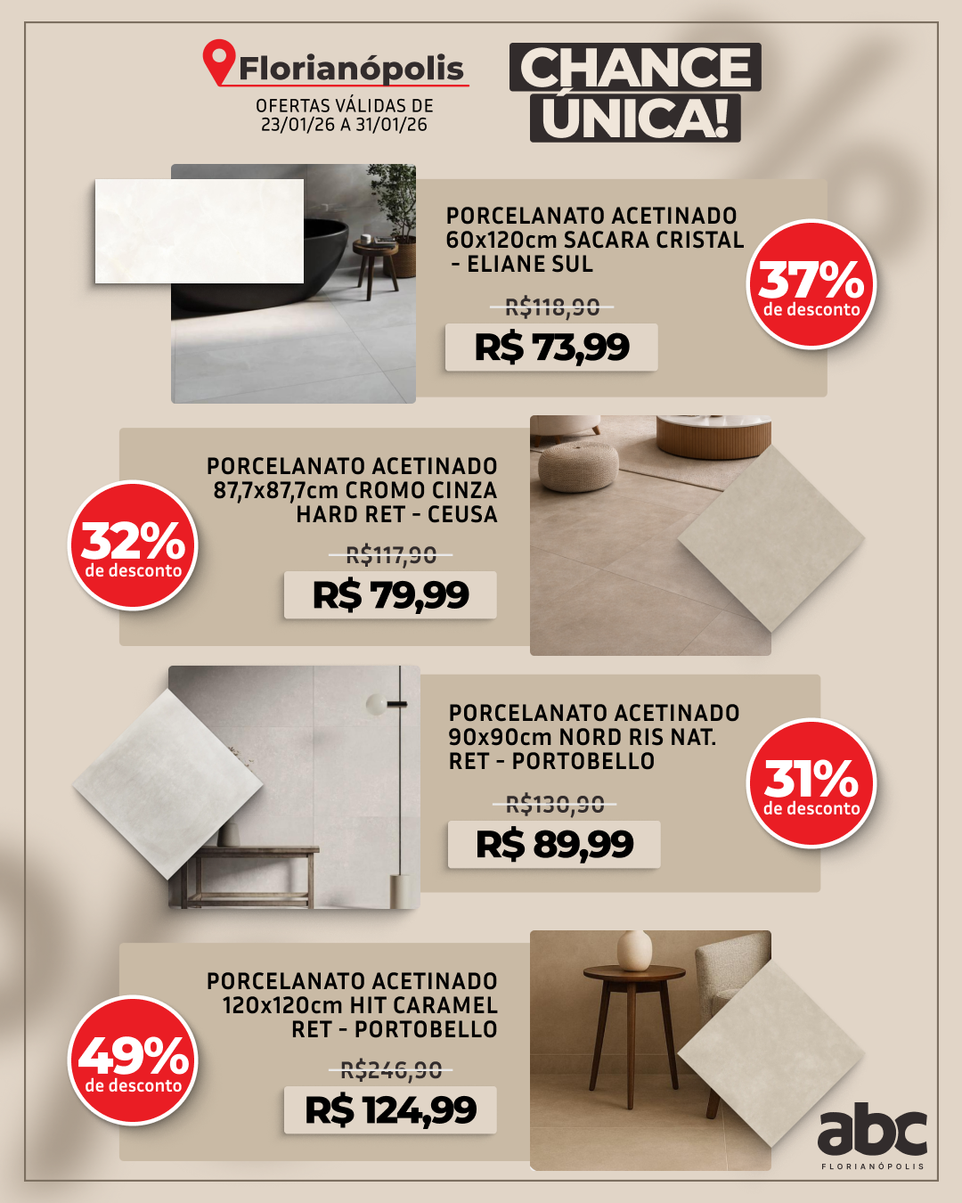 Rafa, vamos fazer um flyer com 4 porcelanatos da chance única. Destaca a %, valor e a data de até quando vai. Começando sempre pelo mais barato. Faz formato storie e feed.