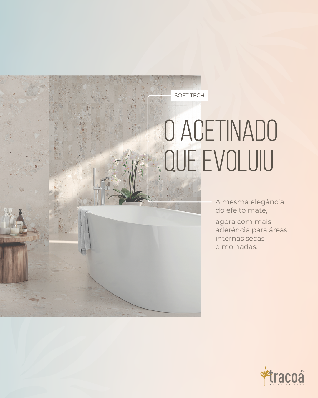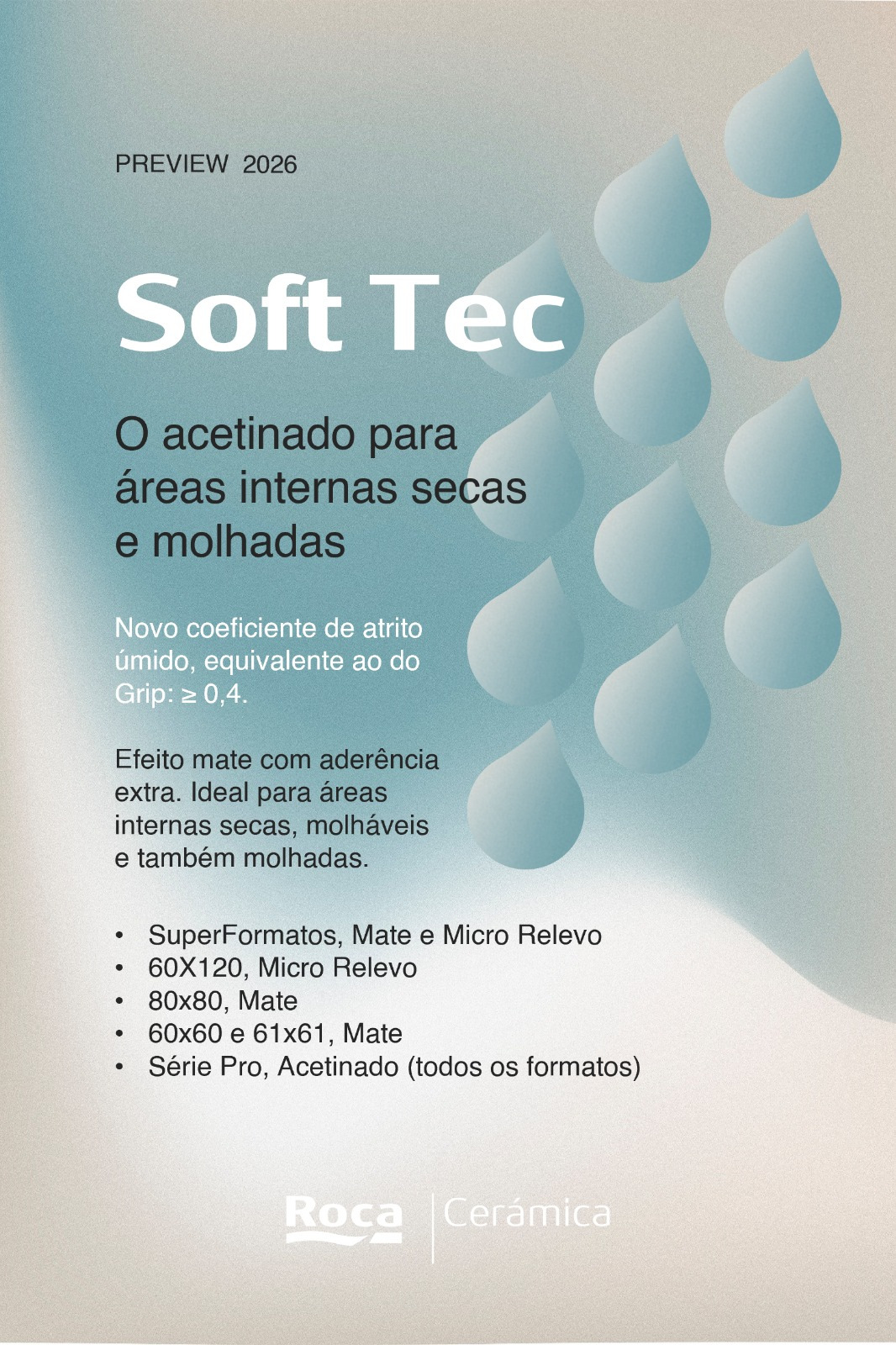 Com a tecnologia Soft Tec, essa limitação evolui. O porcelanato passa a contar com coeficiente de atrito úmido ≥ 0,4 — equivalente ao acabamento Grip, oferecendo maior aderência mesmo em contato com água.