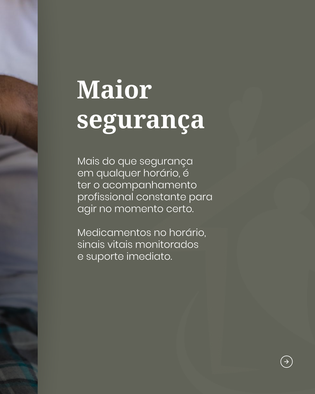 Mais do que segurança em qualquer horário, é ter o acompanhamento profissional constante para agir no momento certo. Medicamentos no horário, sinais vitais monitorados e suporte imediato.
