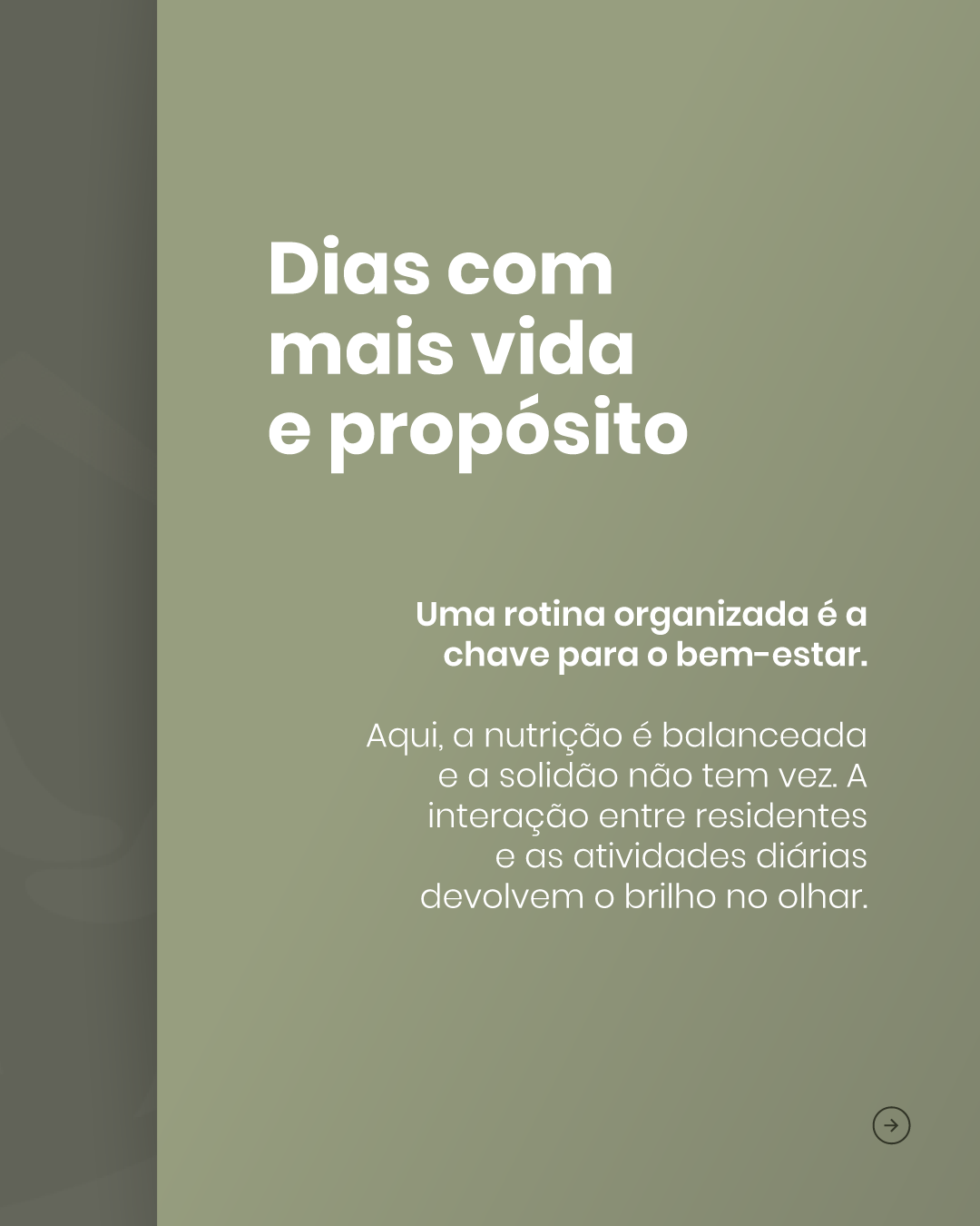 Uma rotina organizada é a chave para o bem-estar. Aqui, a nutrição é balanceada e a solidão não tem vez. A interação entre residentes e as atividades diárias devolvem o brilho no olhar.