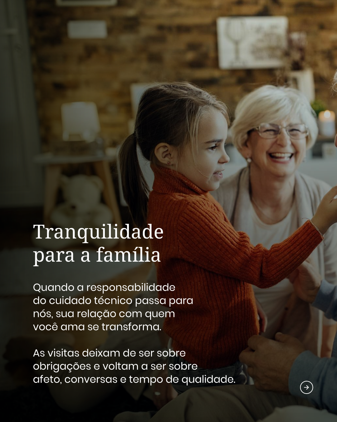 Quando a responsabilidade do cuidado técnico passa para nós, sua relação com quem você ama se transforma. As visitas deixam de ser sobre obrigações e voltam a ser sobre afeto, conversas e tempo de qualidade.