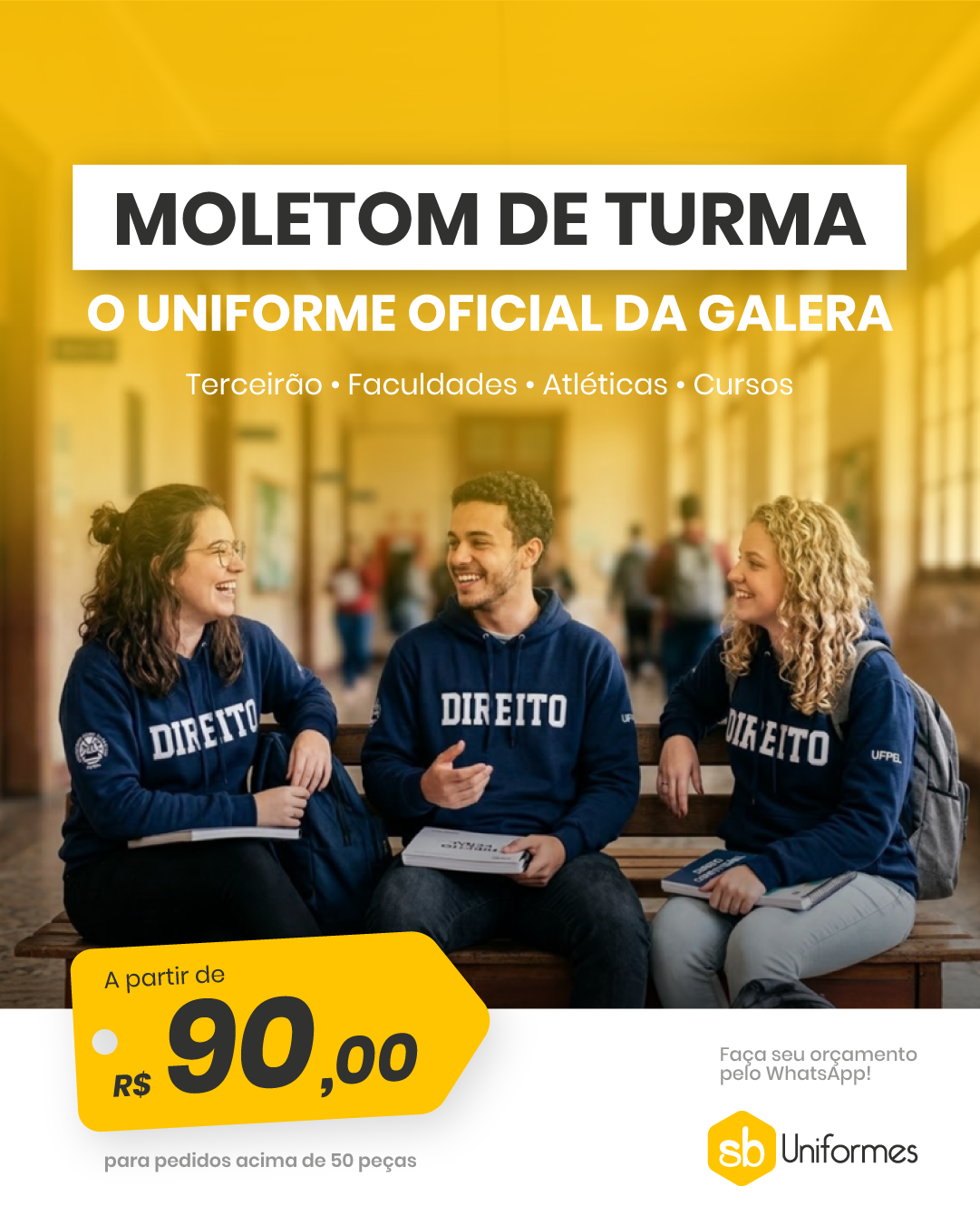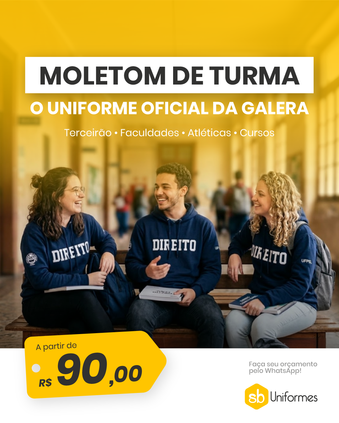 Gabi, preciso de um CARD que mostre moletom de turma, sabe? Terceirão, faculdade e etc, este tipo de turma. A ideia é mostrar que temos opções a partir de R$90. Consegue organizar o card + copy?! Eu estou sem foto.