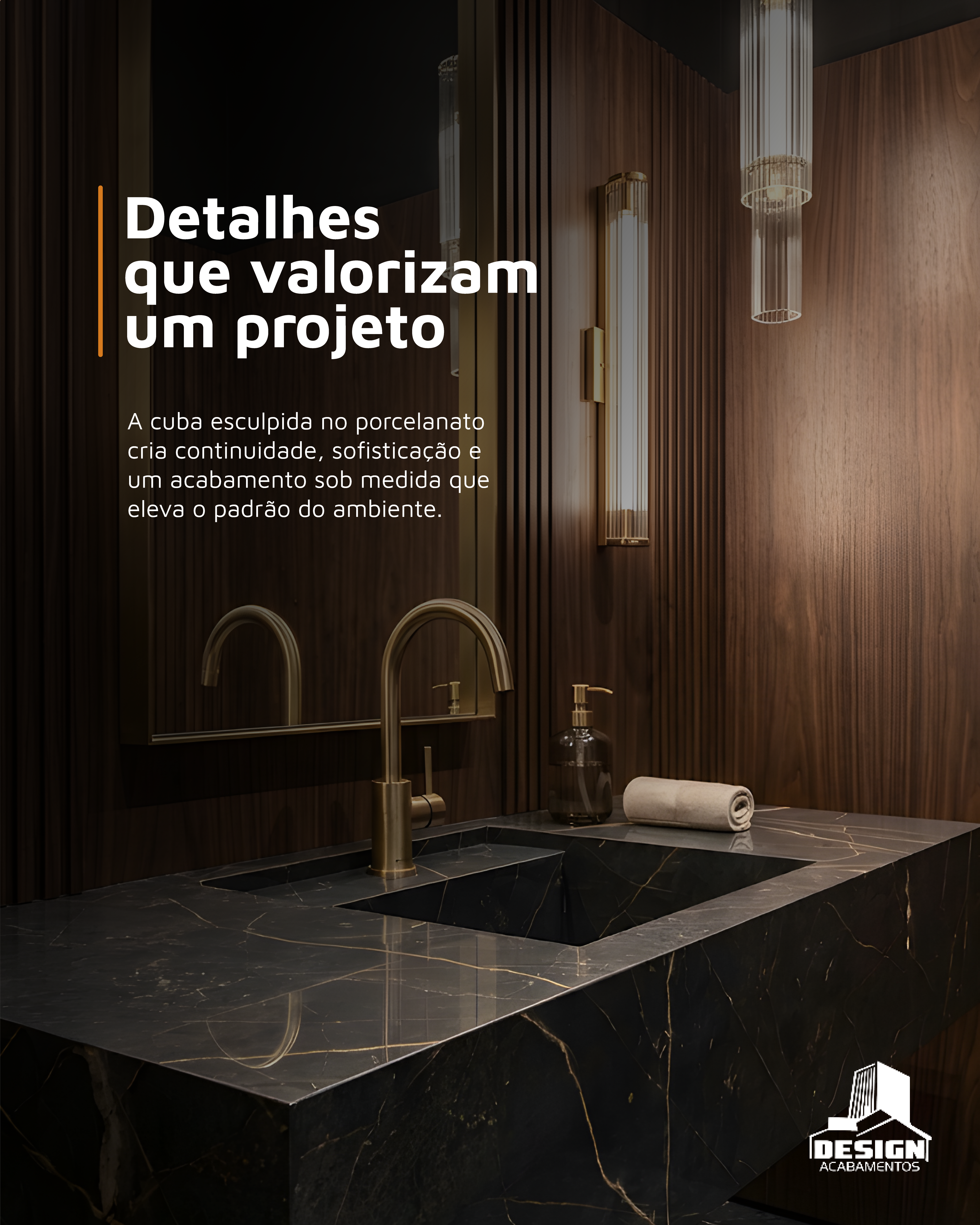 Na Design Acabamentos, produzimos cubas esculpidas sob medida, pensadas para conversar com o porcelanato e com o ambiente do cliente.