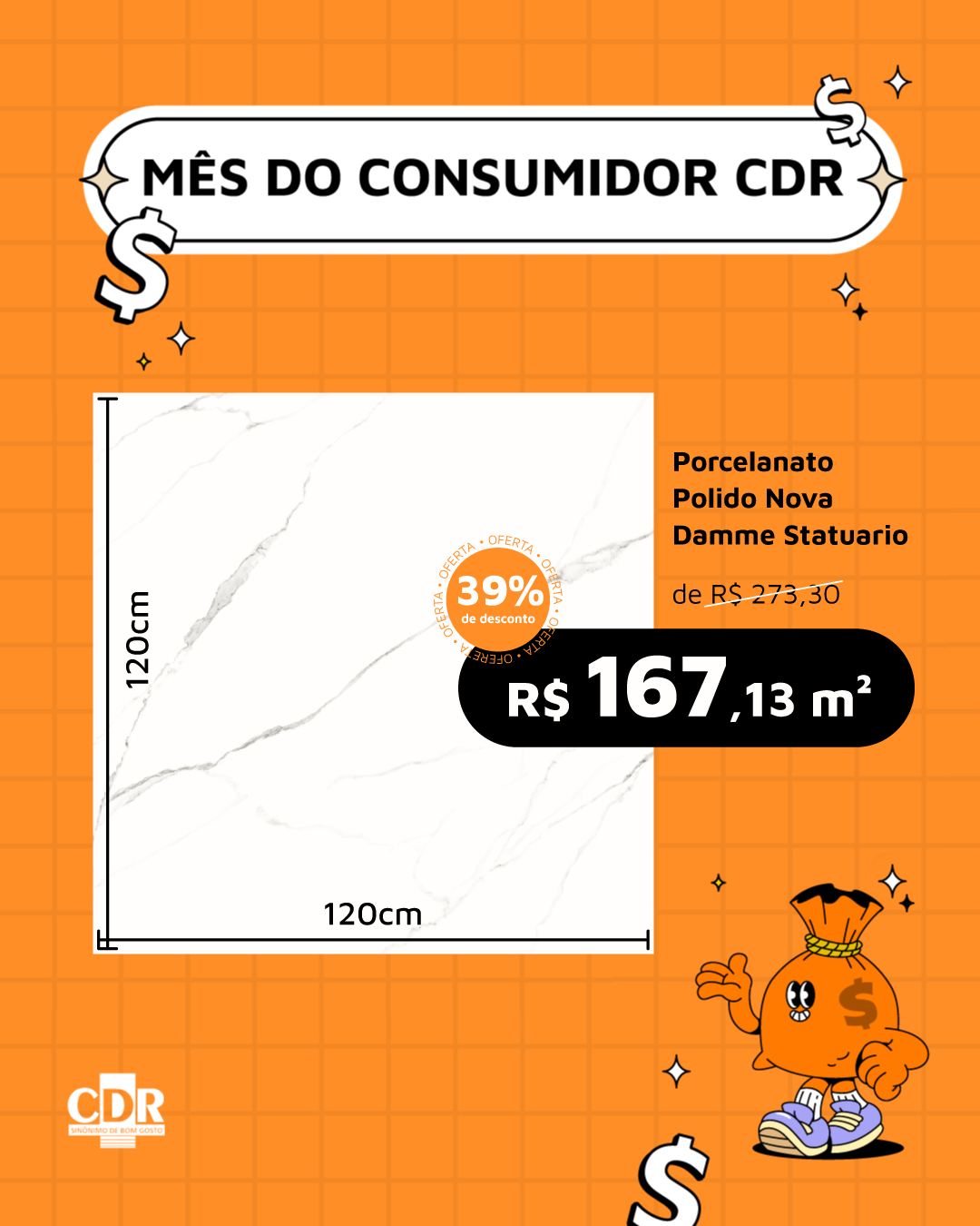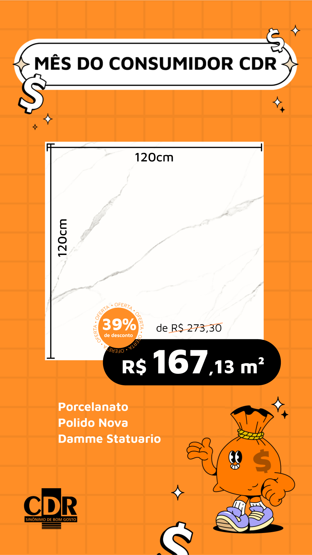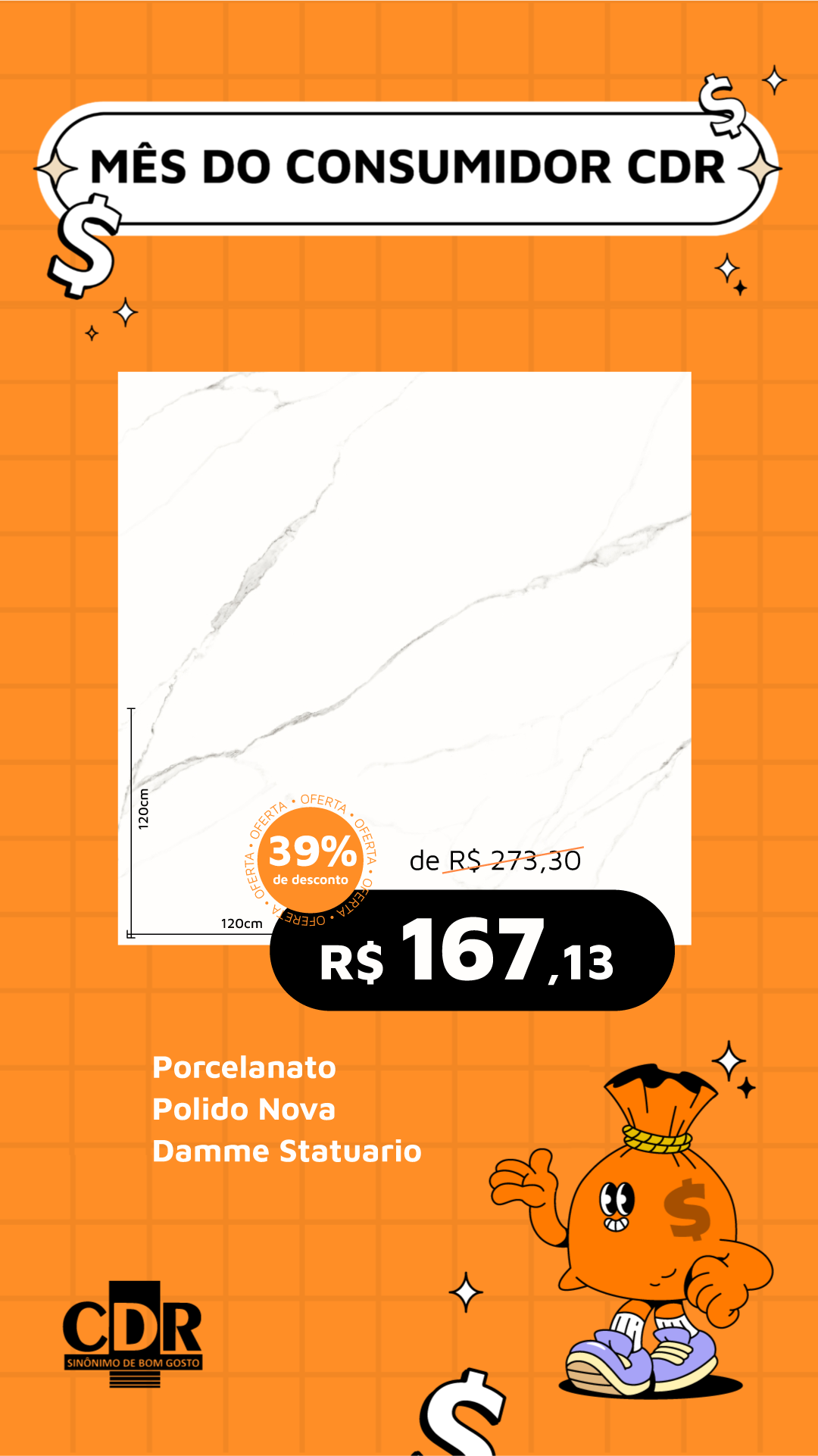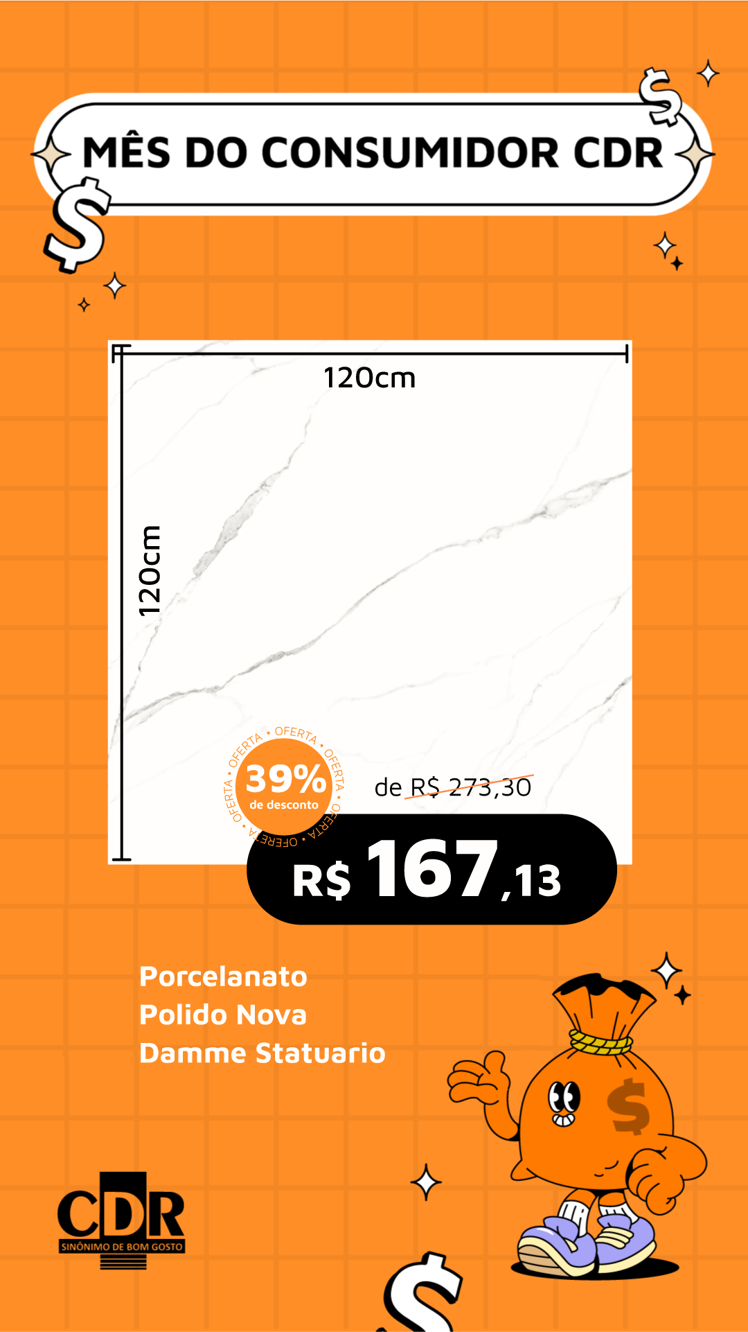Gabi, vamos fazer um segundo modelo desse piso. Preciso que coloque bem destacado o tamanho do piso 120x120 e coloca o desconto logo abaixo de preço também destacado.