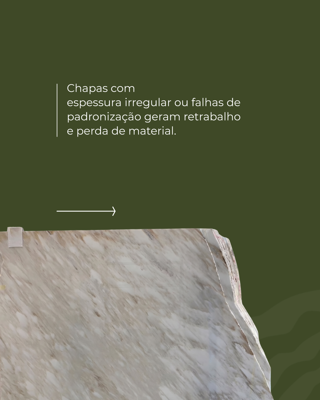 O talento da sua equipe de instalação ou da sua marmoraria merece uma matéria-prima à altura. Trabalhar com chapas de procedência duvidosa é assumir o risco de retrabalho e desperdício.