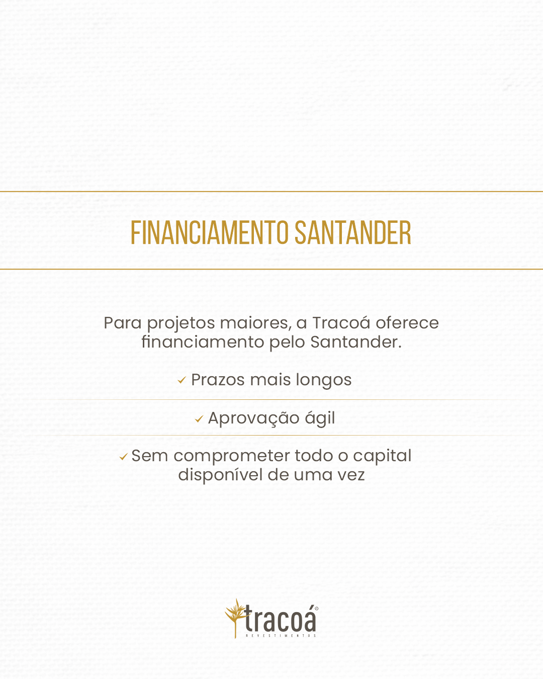 A Tracoá oferece parcelamento em até 10x no cartão e financiamento pelo Santander — para que o orçamento disponível hoje não defina a qualidade do projeto que vai durar décadas.