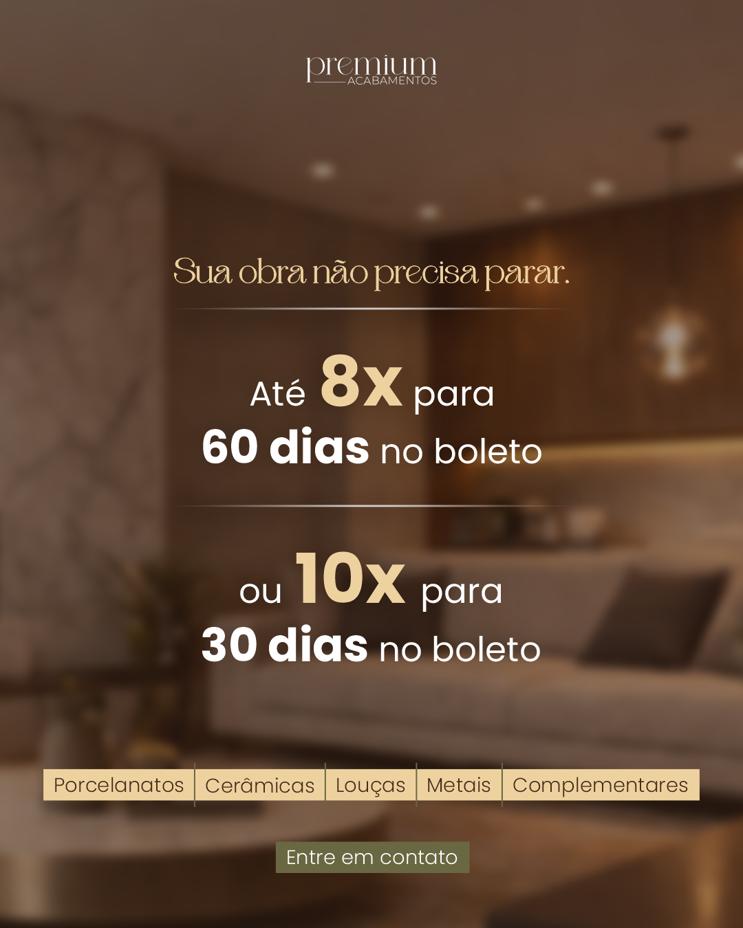 A gente sabe que a fase de acabamentos exige planejamento financeiro. Por isso, na Premium, além de encontrar as melhores marcas e uma equipe técnica pronta para te orientar, você também encontra flexibilidade de verdade.