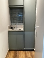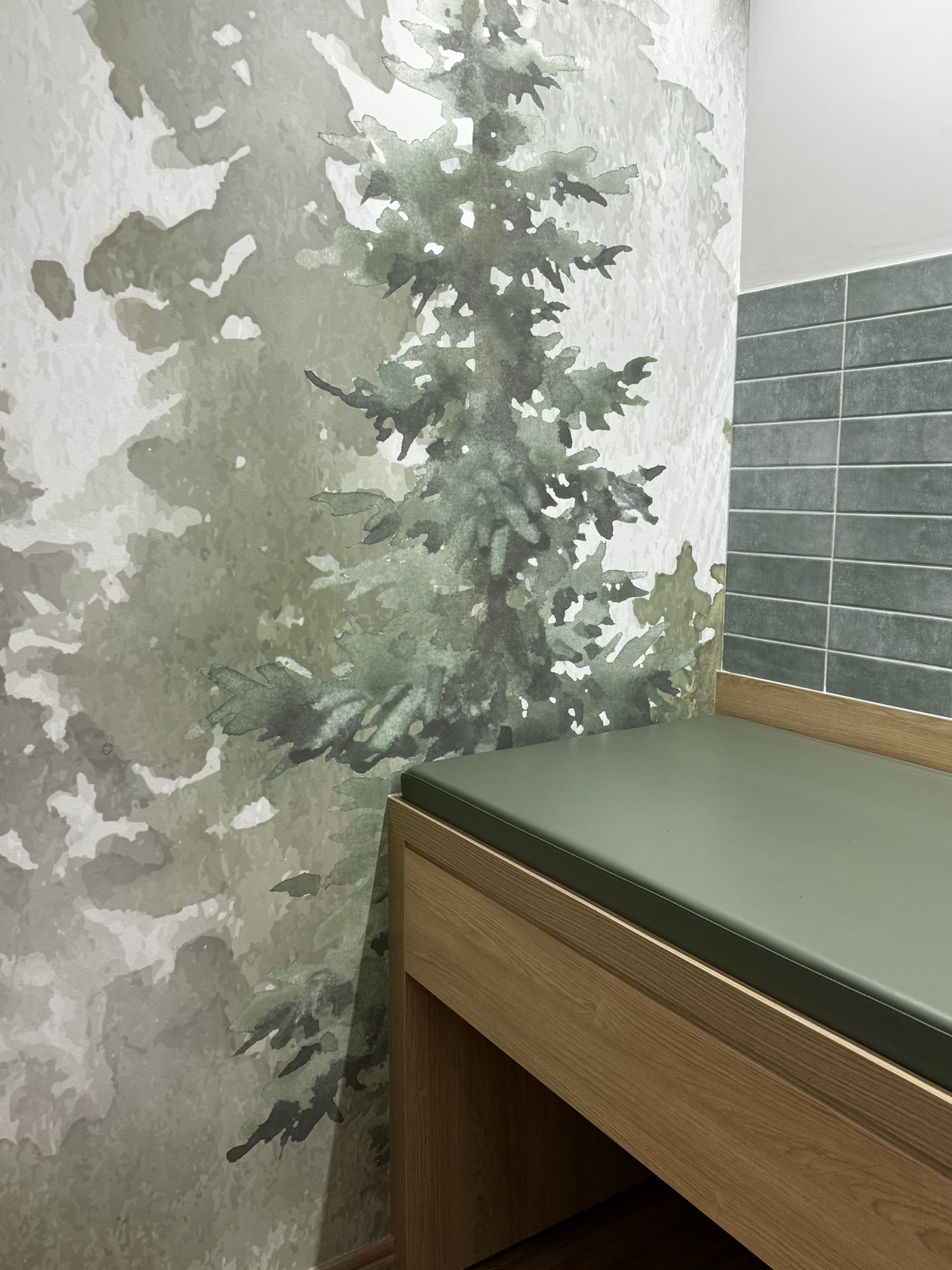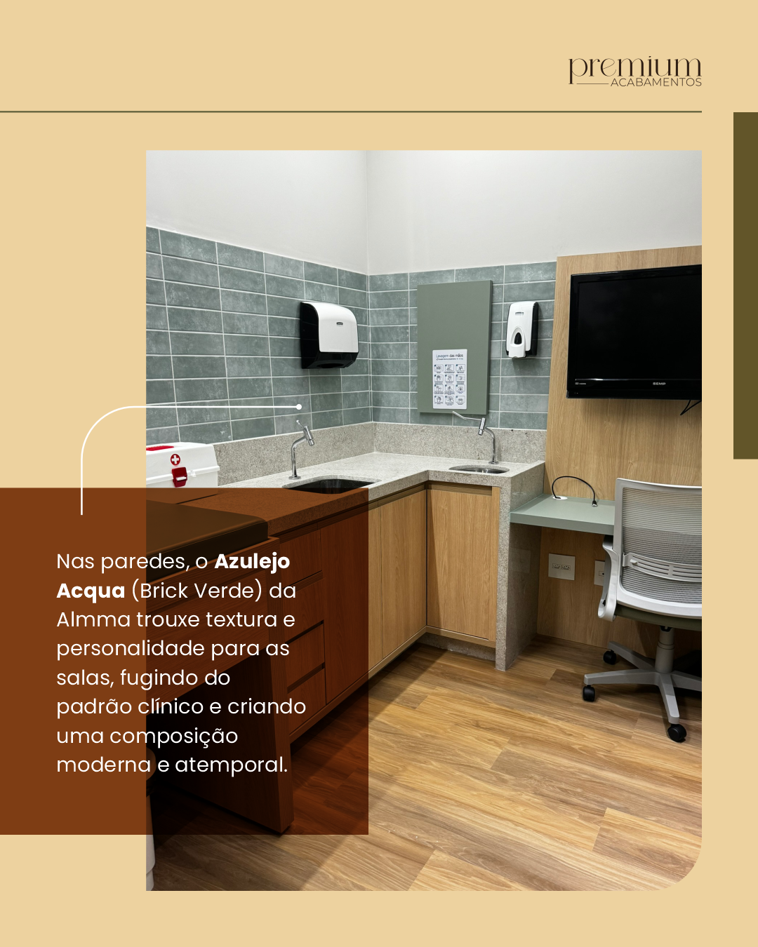 Nas paredes, o Azulejo Acqua (Brick Verde) da Almma trouxe textura e personalidade para as salas, fugindo do padrão clínico e criando uma composição moderna e atemporal.