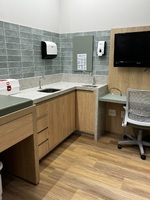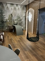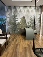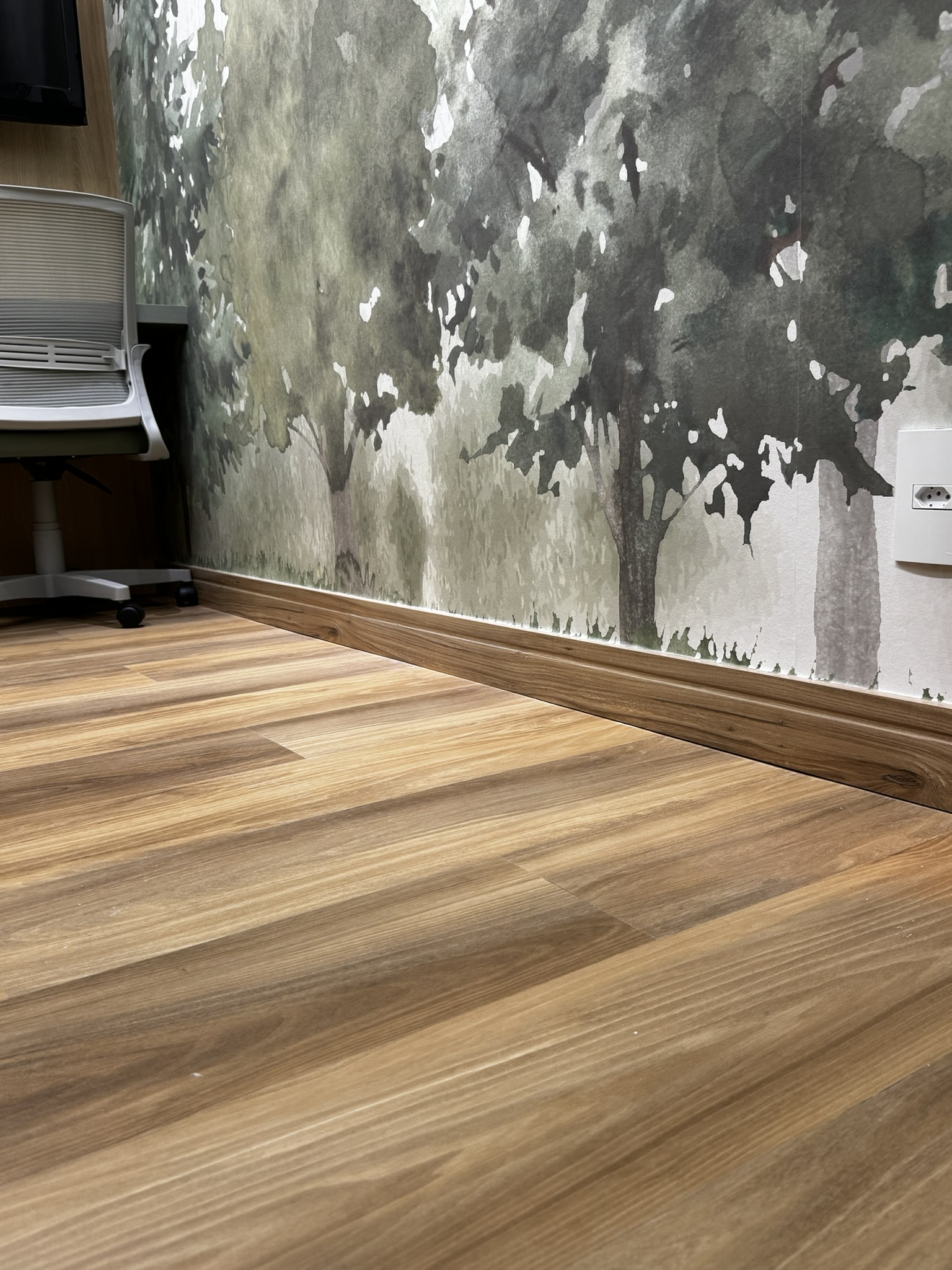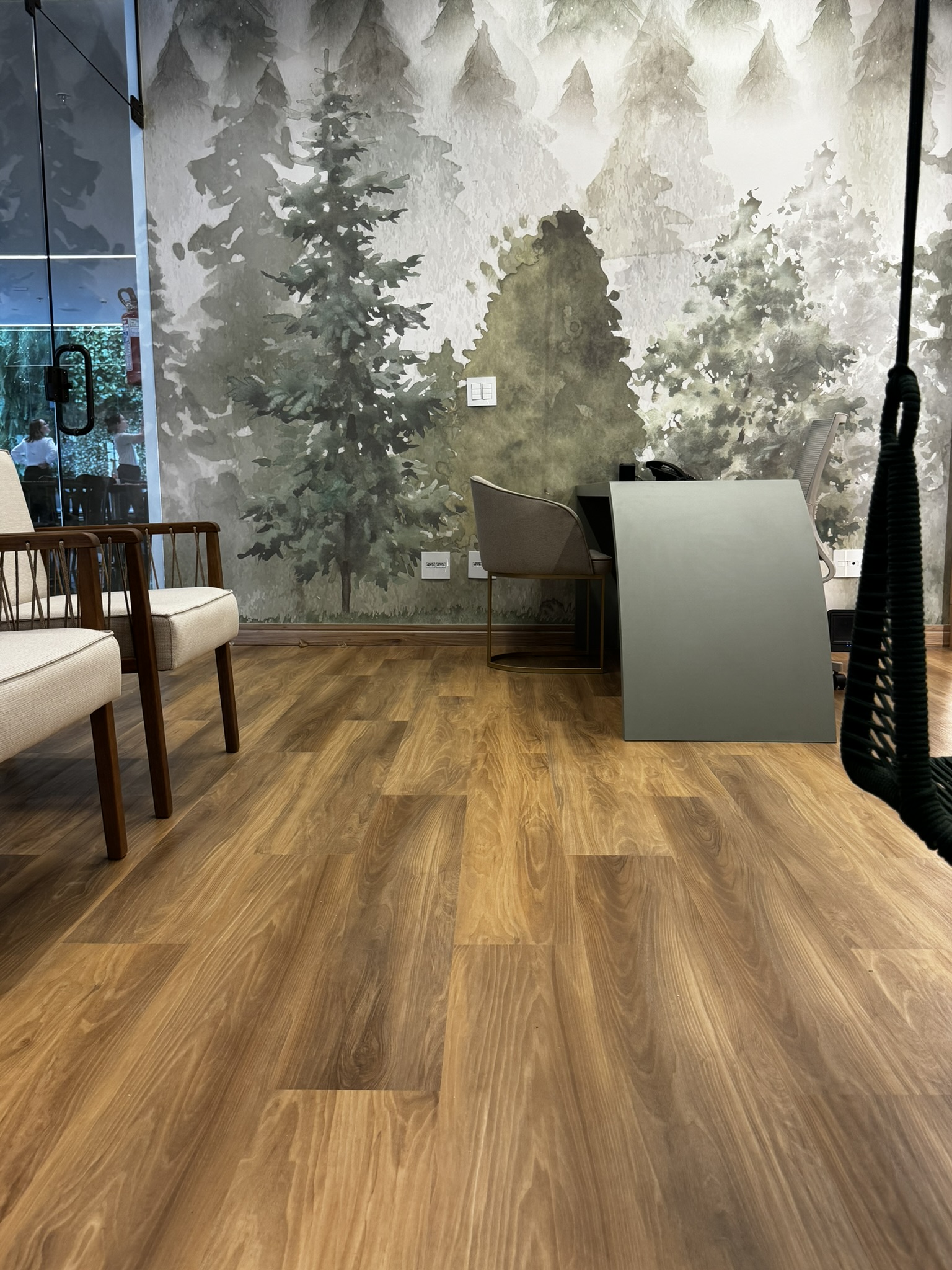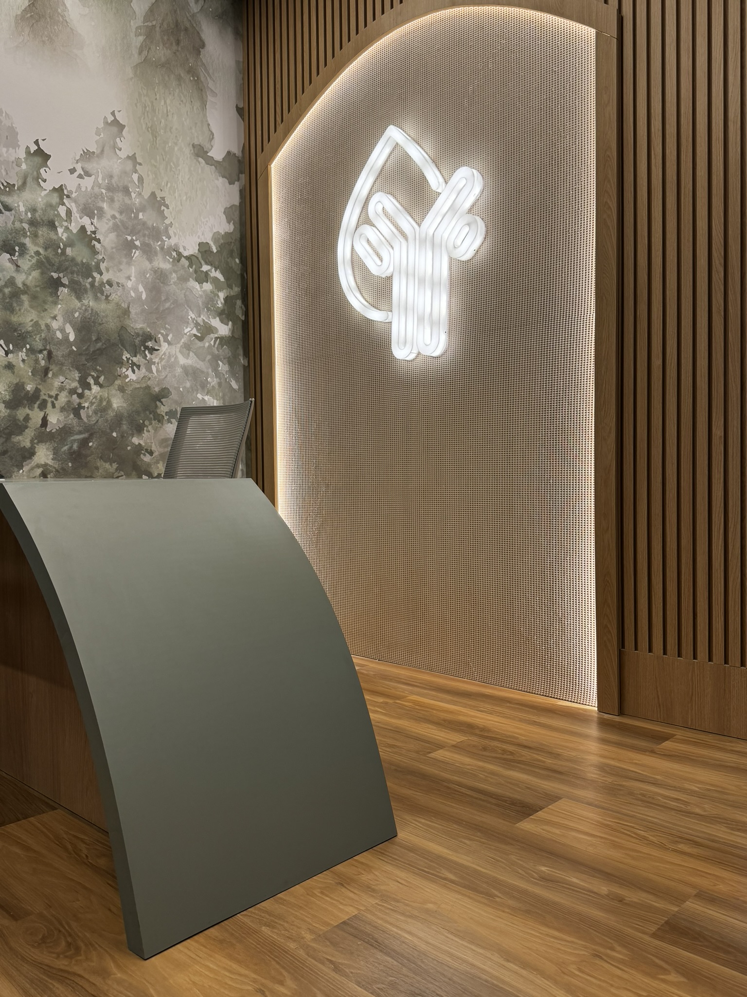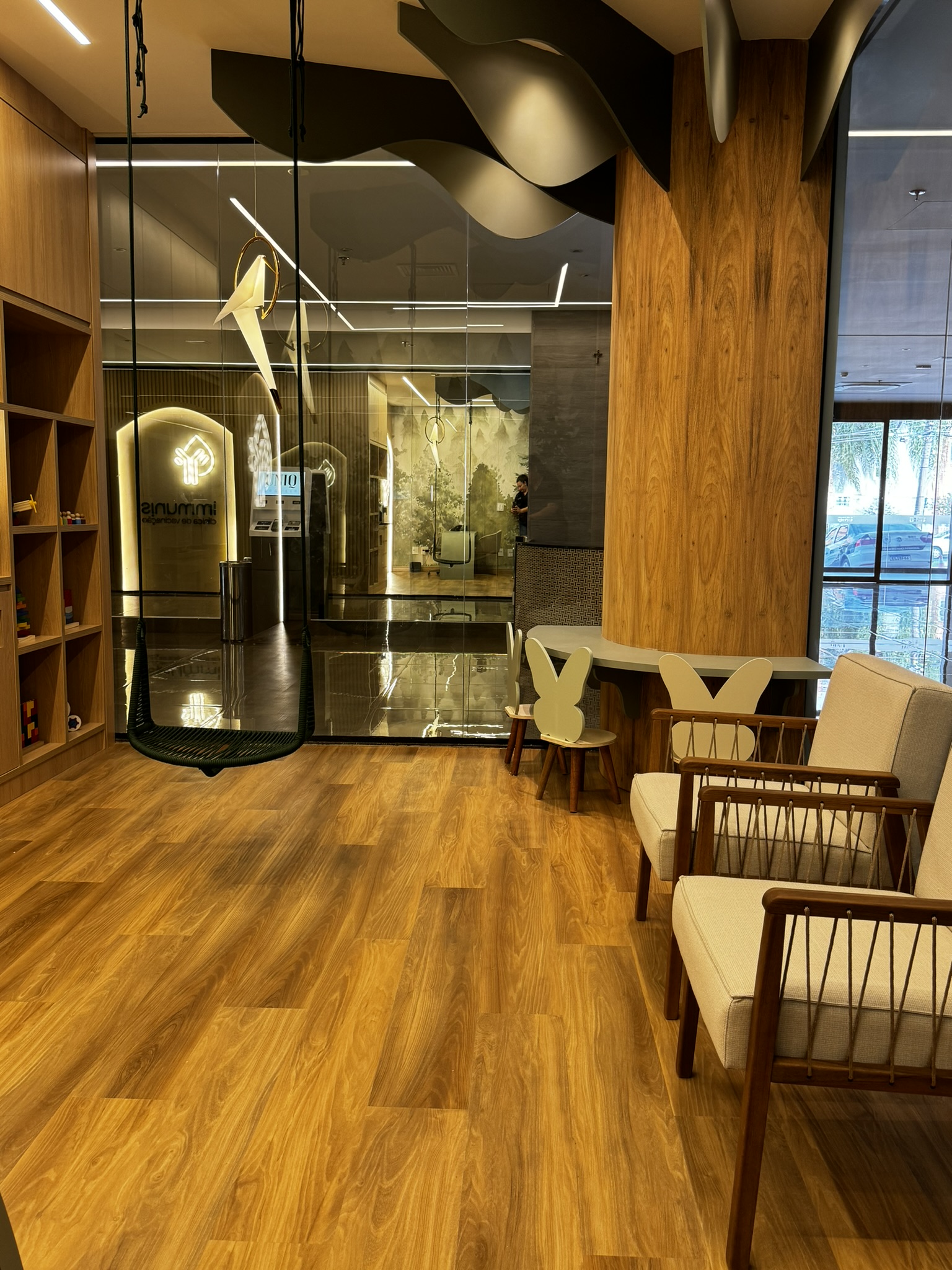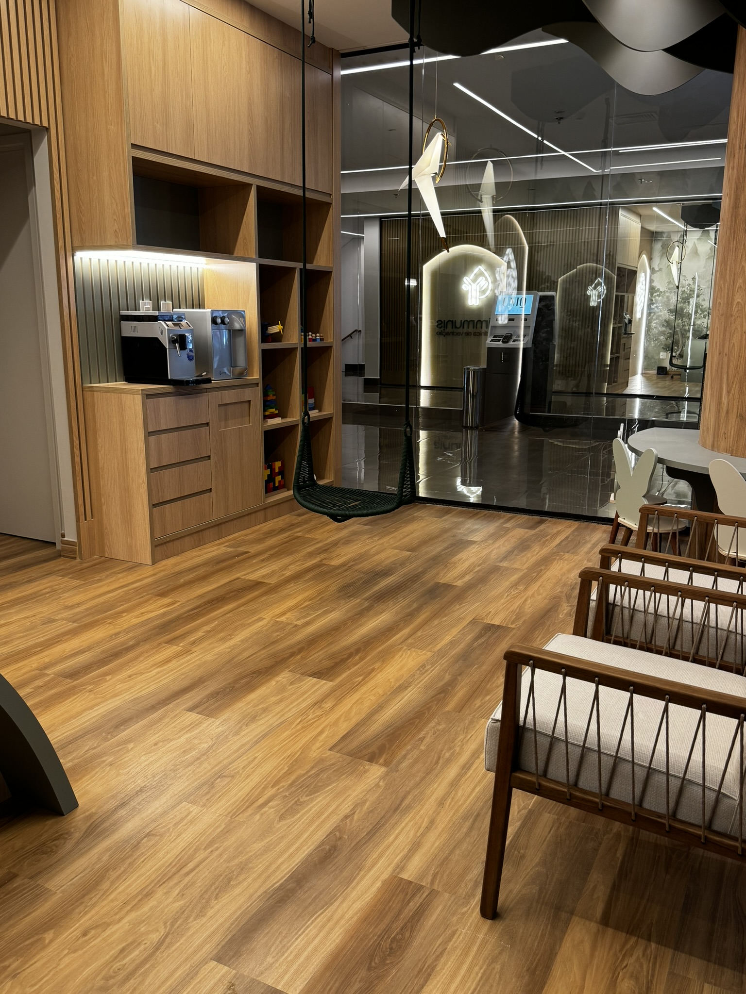 Para o piso, a escolha foi o Vinílico LVT Injoy da Tarkett, que trouxe o aconchego da madeira, aquecendo o ambiente e garantindo conforto acústico para toda a área de atendimento.