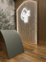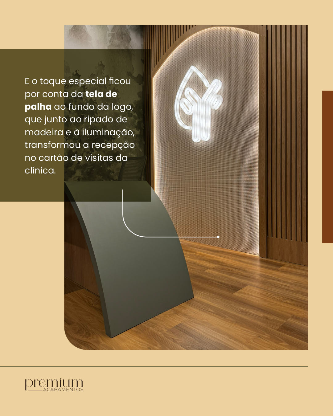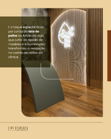 E o toque especial ficou por conta da tela de palha ao fundo da logo, que junto ao ripado de madeira e à iluminação, transformou a recepção no cartão de visitas da clínica.