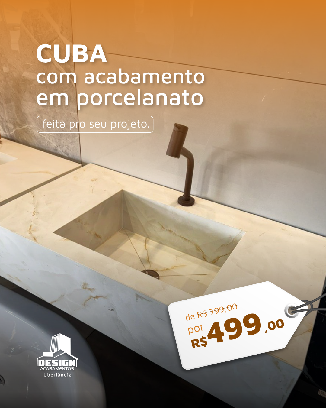 Criativo para anúncio pago. Usar foto de cuba com acabamento bem visível e impecável. Arte clean, produto em destaque. Comunicação que valorize a personalização sem parecer inacessível.