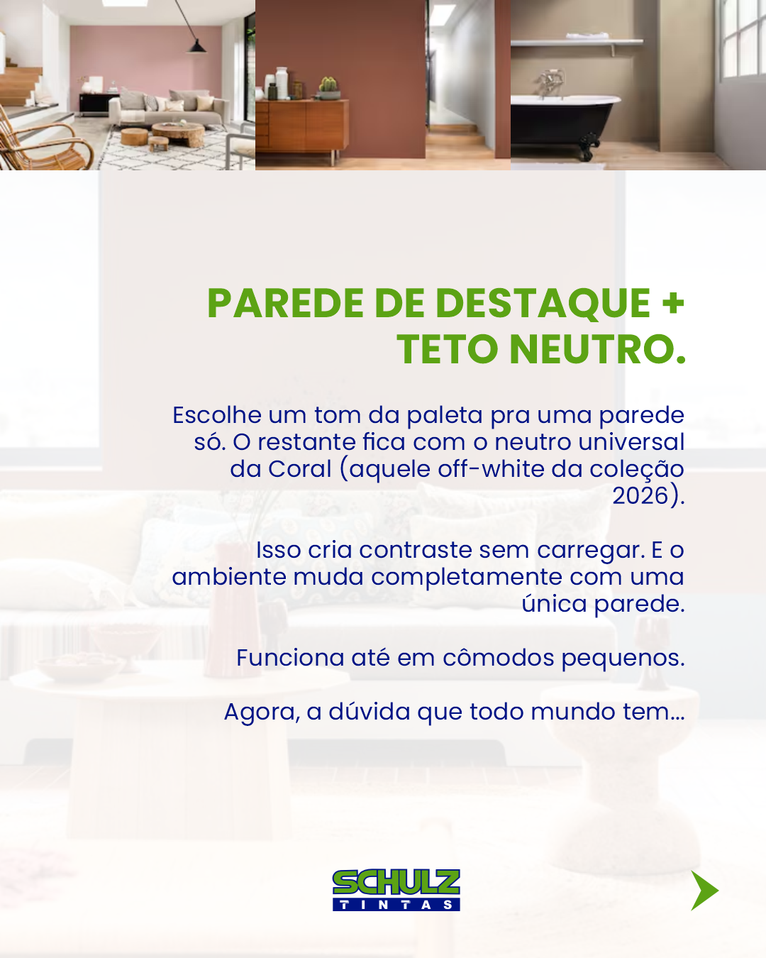 Escolhe um tom da paleta pra uma parede só. O restante fica com o neutro universal da Coral (aquele off-white da coleção 2026).