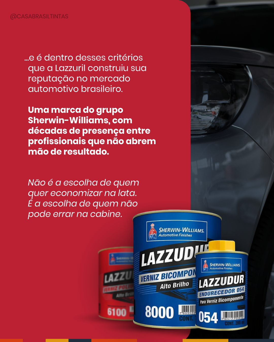 Autoridade de marca com foco na Lazzuril, linha do grupo Sherwin-Williams com tradição no mercado de pintura automotiva brasileiro. O conteúdo fala diretamente com o pintor automotivo, mostrando que a Casa Brasil entende as exigências desse profissional e trabalha com o produto certo pra ele. Tom técnico e respeitoso com quem vive de resultado.