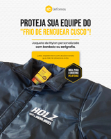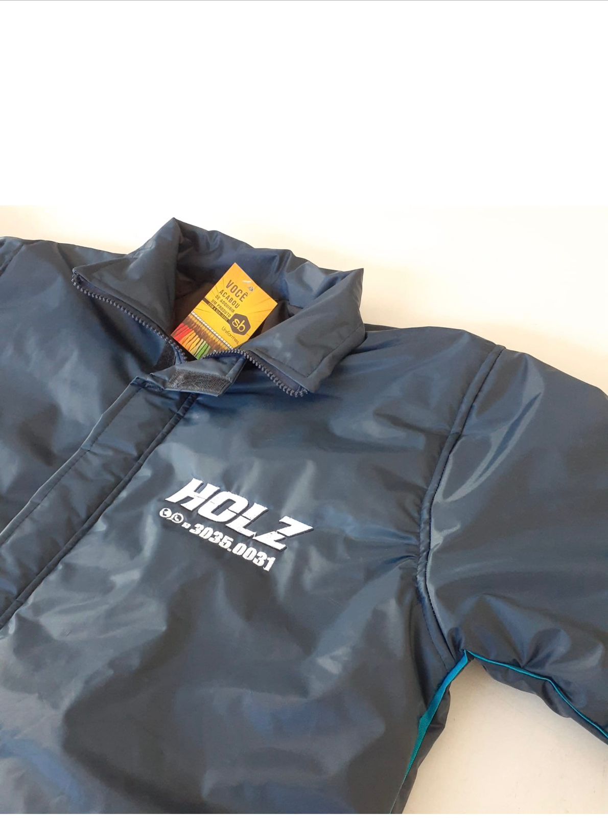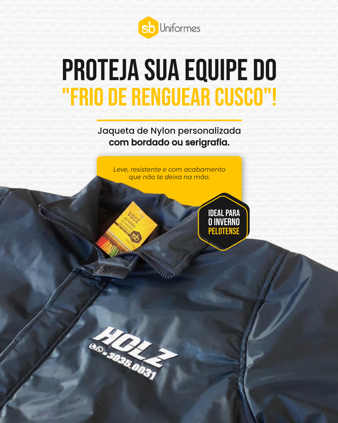 Usar a foto da jaqueta de nylon azul (HOLZ) como referência de estilo. Layout limpo, fundo neutro, destaque para a peça. Pode usar um selo tipo "Ideal para o inverno pelotense".