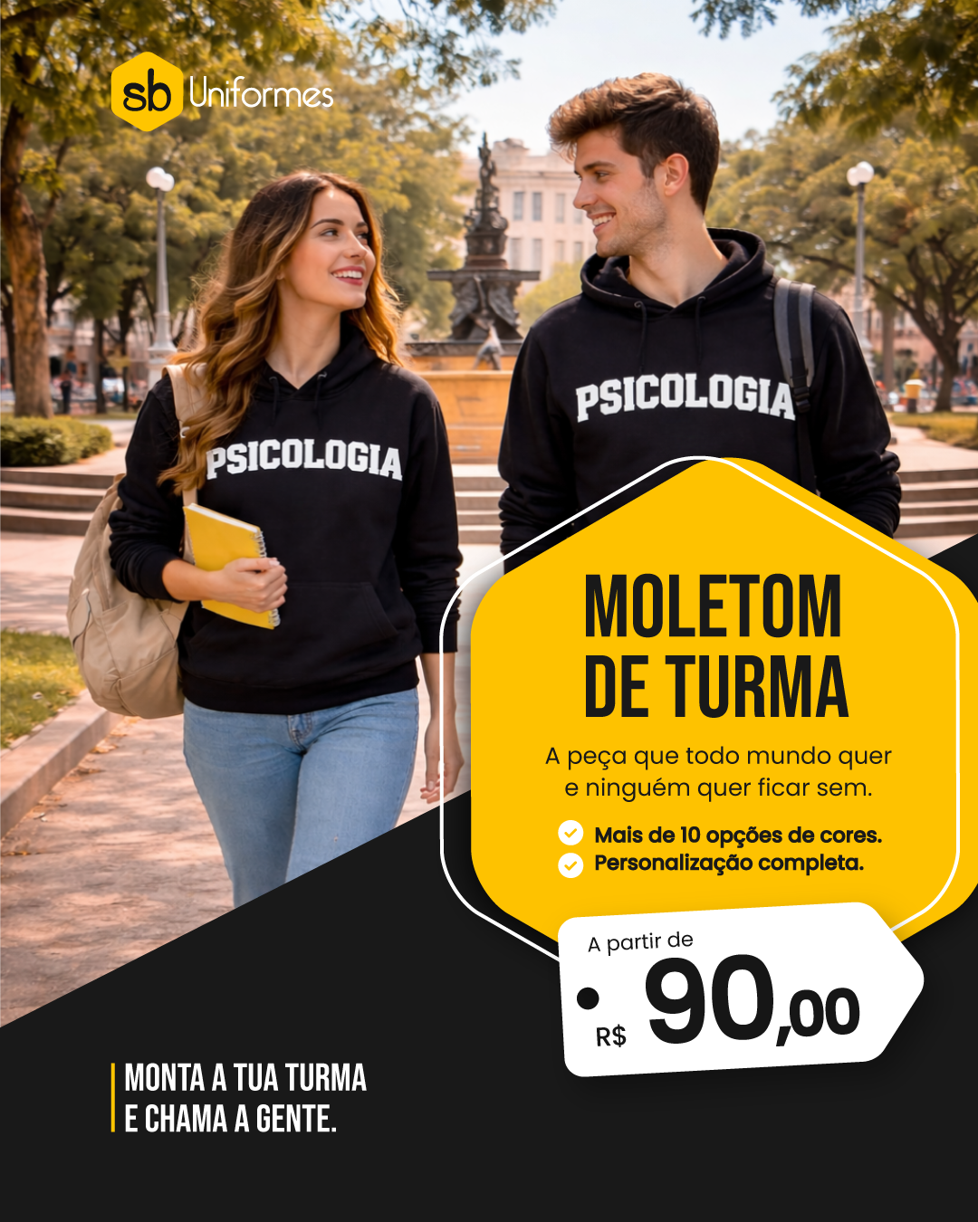 Usar fotos já existentes de moletons de turma ou solicitar novas. Visual jovem, colorido, com energia de grupo. Pode ter elementos como emojis de turma, hashtag da campanha, preço a partir de.
