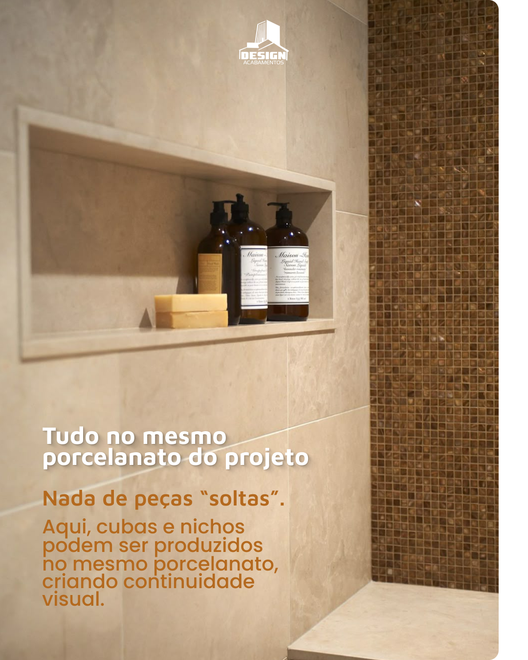 Aqui, cubas e nichos podem ser produzidos no mesmo porcelanato, criando continuidade visual.
